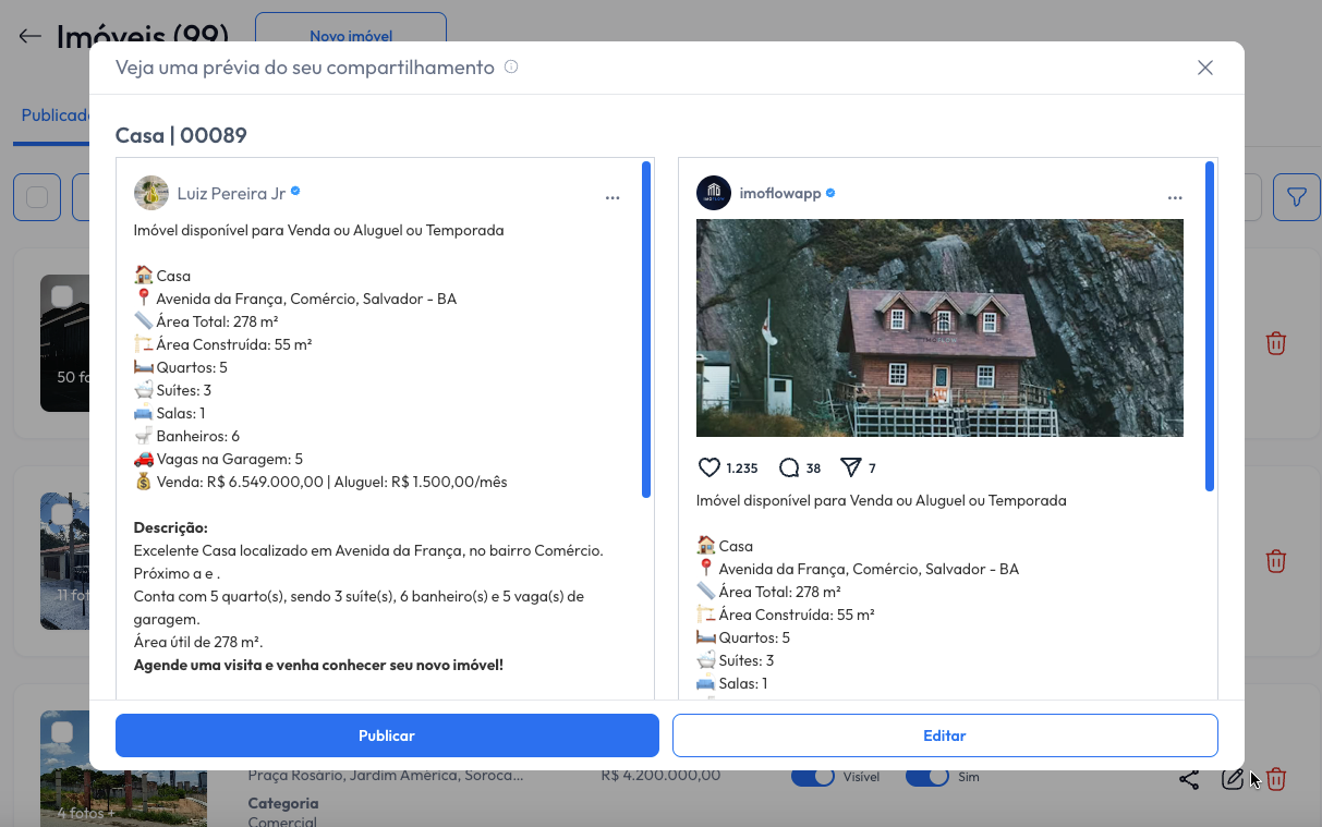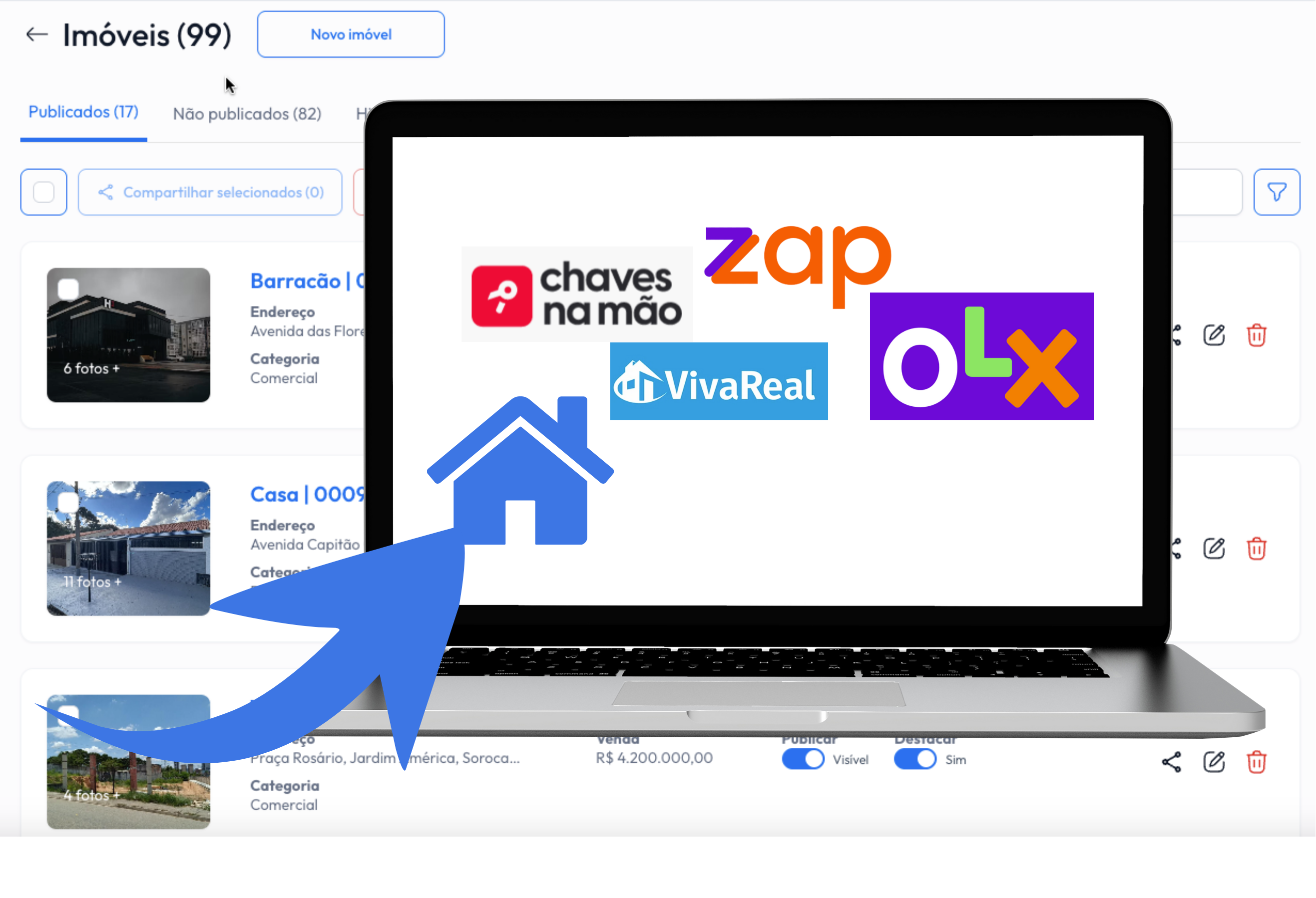 Organize, edite e publique seus imóveis com facilidade. Toda a base de imóveis centralizada e pronta para divulgação em portais e redes sociais.